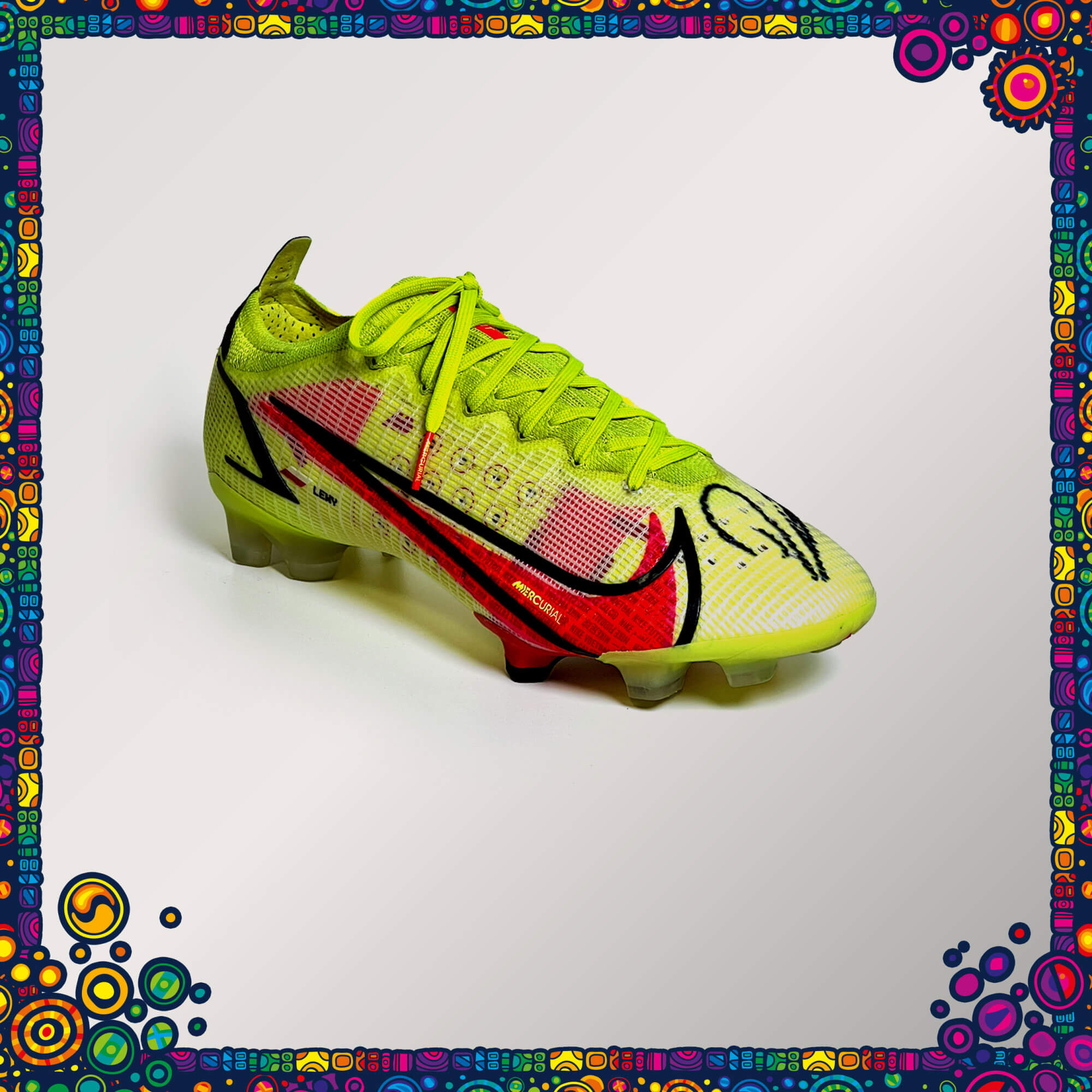 Autentyczny prawy but meczowy marki Nike, używany przez Roberta Lewandowskiego w sezonie 2025/2026. Na bucie znajduje się osobista dedykacja „Klara” oraz własnoręczny podpis zawodnika.