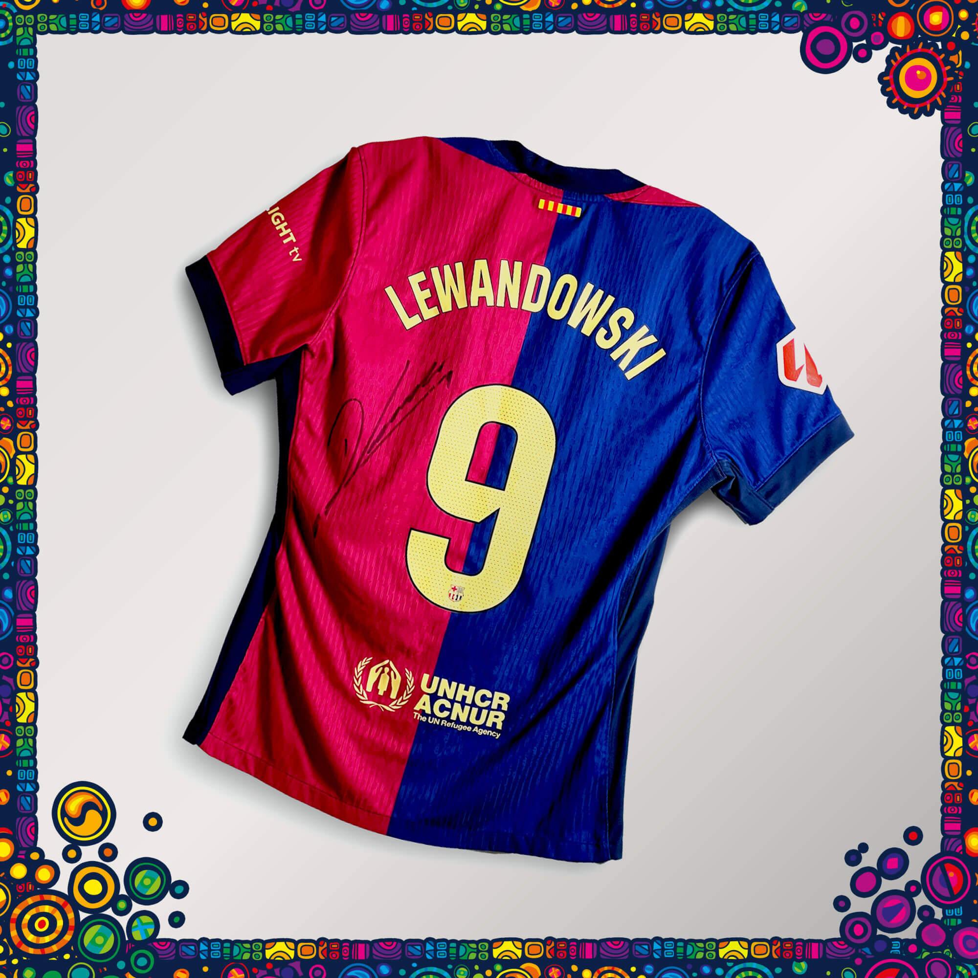 Oryginalna koszulka meczowa z mistrzowskiego sezonu FC Barcelony, zakończonego zdobyciem mistrzostwa Hiszpanii, Pucharu Króla oraz Superpucharu Hiszpanii. Autograf Roberta Lewandowskiego czyni ją wyjątkowym przedmiotem kolekcjonerskim.